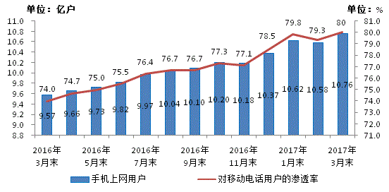 2016-2017年3月手機(jī)上網(wǎng)用戶和對移動電話用戶滲透率情況